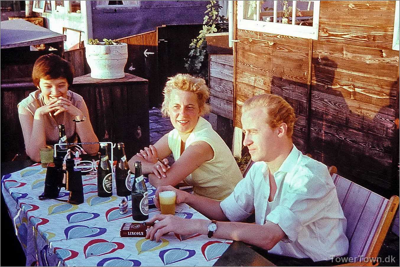 ...og her hvor Margit (h38) med tørklædet, Tove (h17A) med parasol, Åse (h36), Johannes (h38) og Hans (h15A) får kaffe og øl.